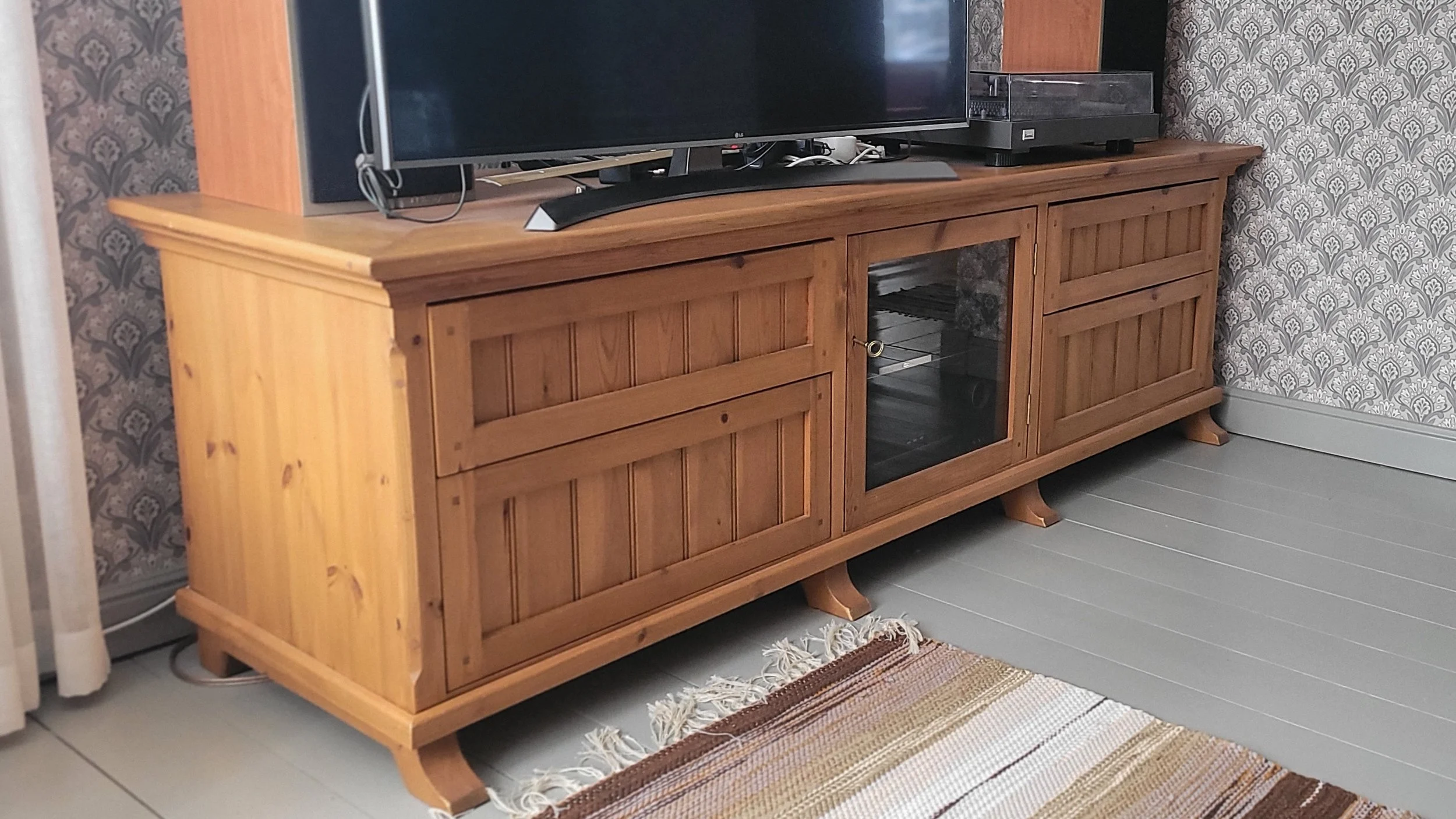 Ostamamme rintamamiestalo kaipasi tietenkin sisustamista sekä remonttia ja näihin otettiin periaatteeksi se, että lastulevy kulkee ulko-ovesta vain yhteen suuntaan, eli ulos. Huonekaluja haalittiin tutuilta, kirppareilta ja muutama myös antiikkiliikkeistä, kuten talonpoikaistyyliset renginkaappi sekä iso vaatekaappi. Jälkimmäinen toimikin inspiraationa kuvan TV-tasolle.
