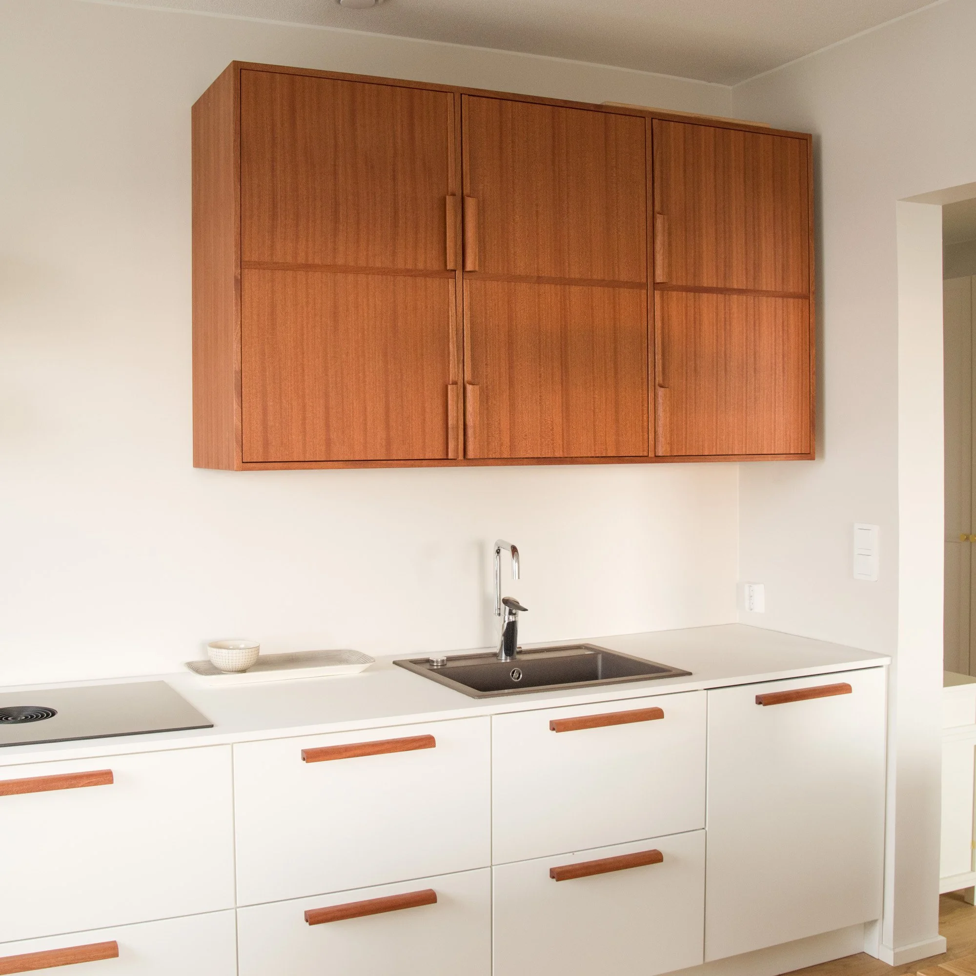 Annemarin ja Teemun asunnossa Puusuti teki keittiöön yläkaapin, avohyllyt ja kaikki vetimet. Alakaapit tulivat keittiökalustefirmalta.